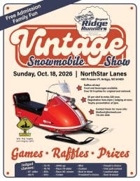 Northstar Lanes 400 Prosser Pl, Antigo, WIThe Bryant Ridge Runners snowmobile club will be holding a vintage snowmobile show to fundraise for trail maintenance on Sunday, October 18 at Northstar Lanes starting at 9am. There will be raffles all day with over 50 trophies for original and restored rides. Fee for entry is $5 per sled, $20 max. Registration runs from…
